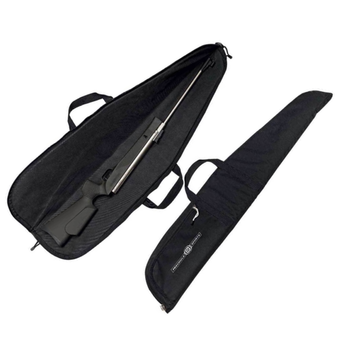 Precihole Sports Rifle case can easily accommodate your scoped air rifle. Good quality polyester and comfortable insides keep your rifle intact and protects it against scratches and dents. Made with high quality zips that will last long. it is Lightweight which makes it comfortable to wear. It has a large zippered pocket outside for storing pellet boxes or any small accessories. It comes with handle as well as a long strap to carry on shoulder. Comes in Black, Khaki and Camo options.